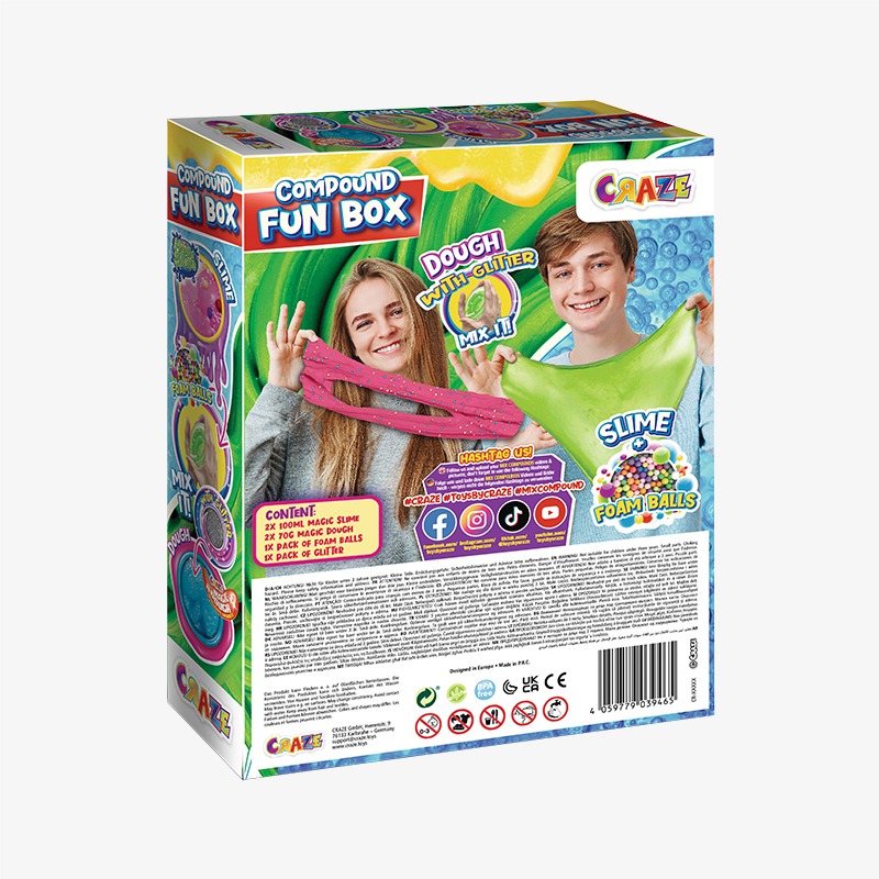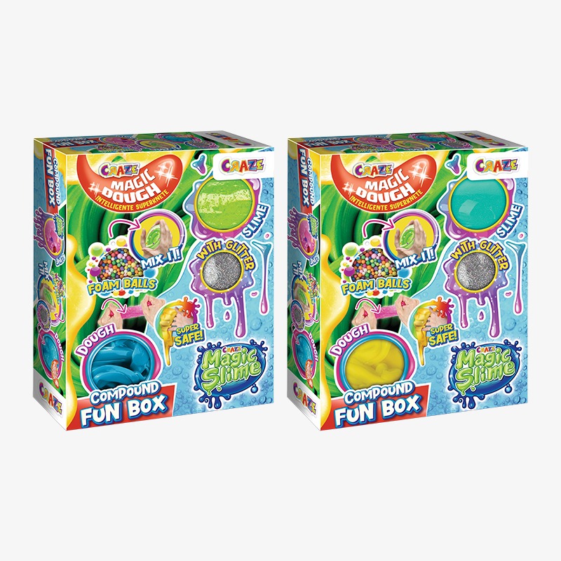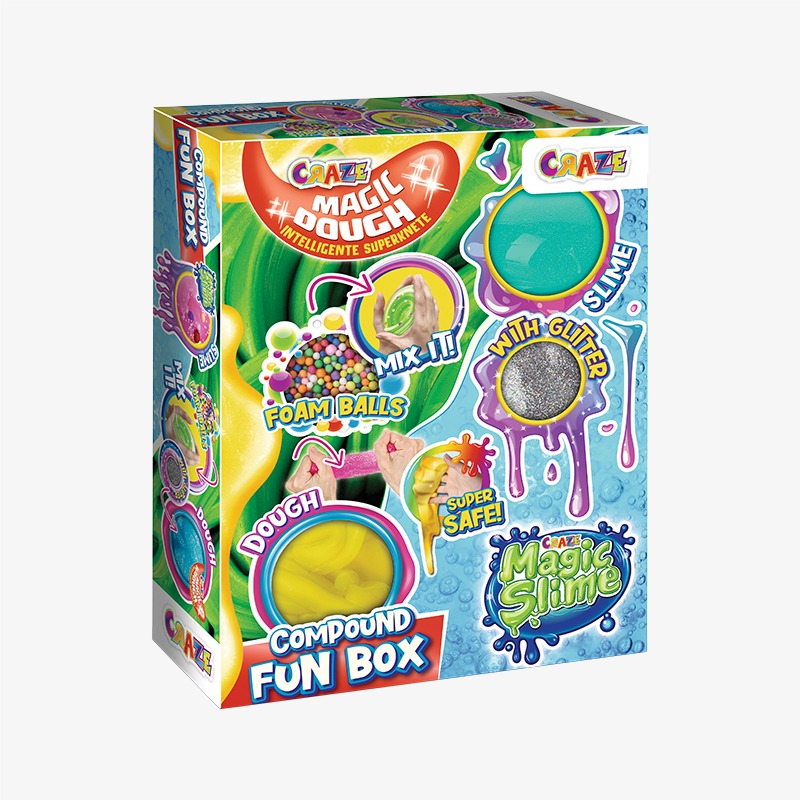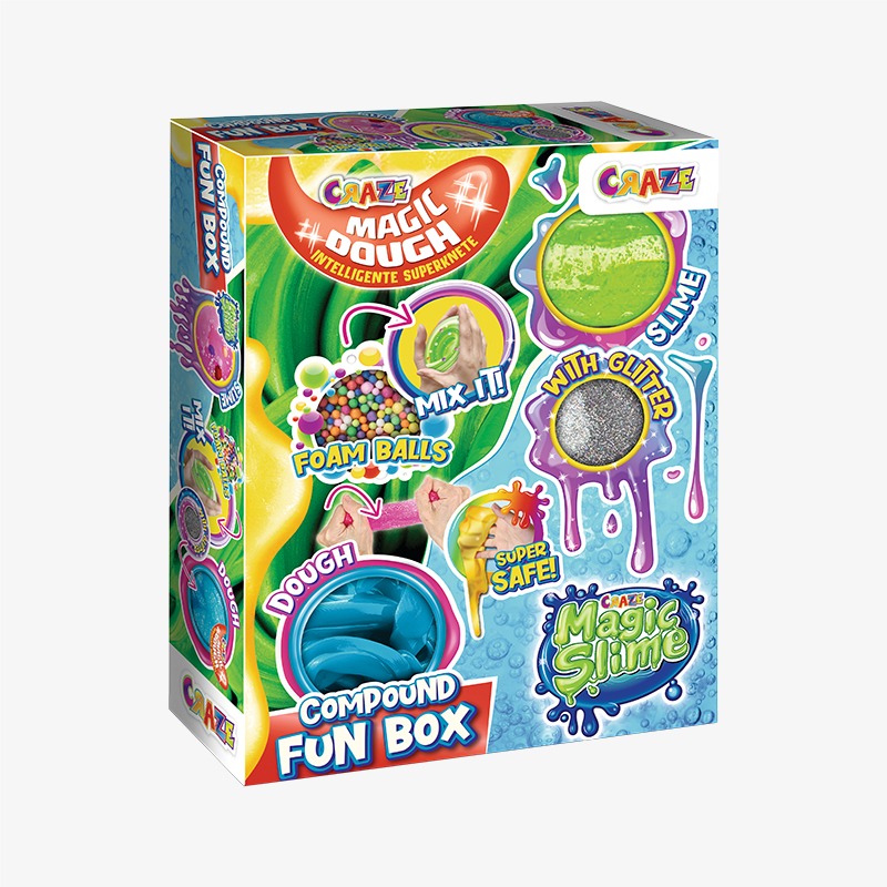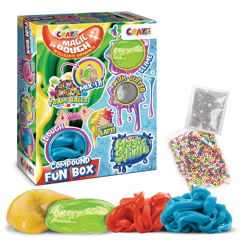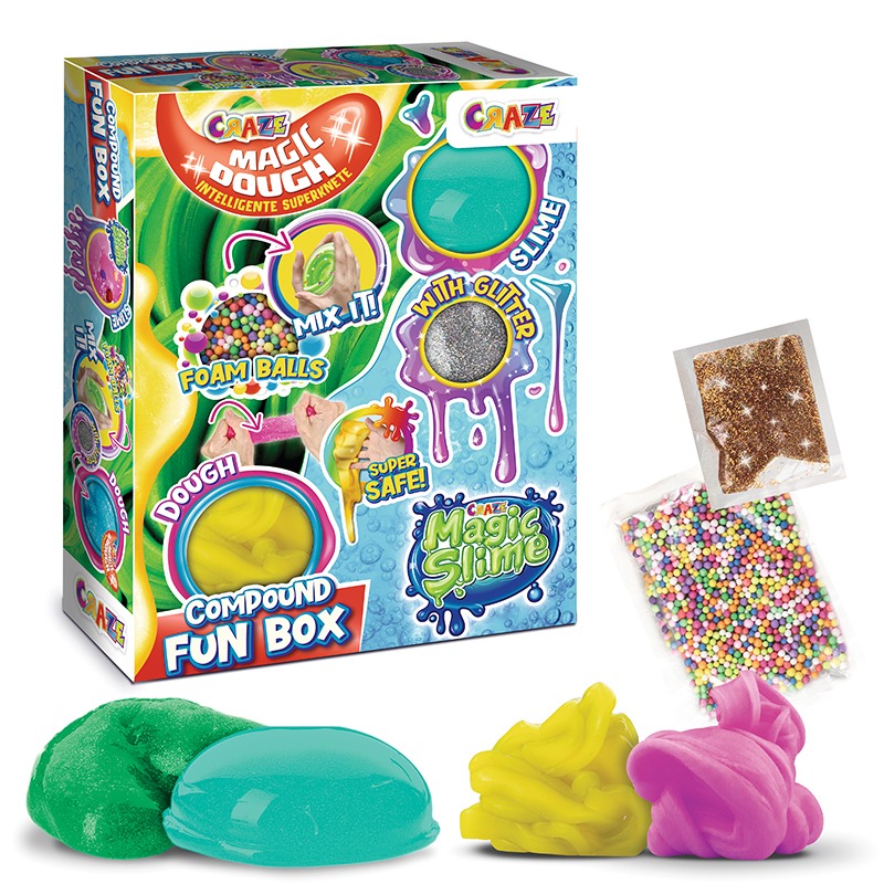 COMPOUND MIX – Fun Box de CRAZE ofrece dos compuestos diferentes, MAGIC DOUGH y MAGIC SLIME, junto con accesorios, como purpurina y perlas, para crear tus propios tipos de compuestos.