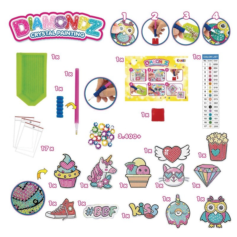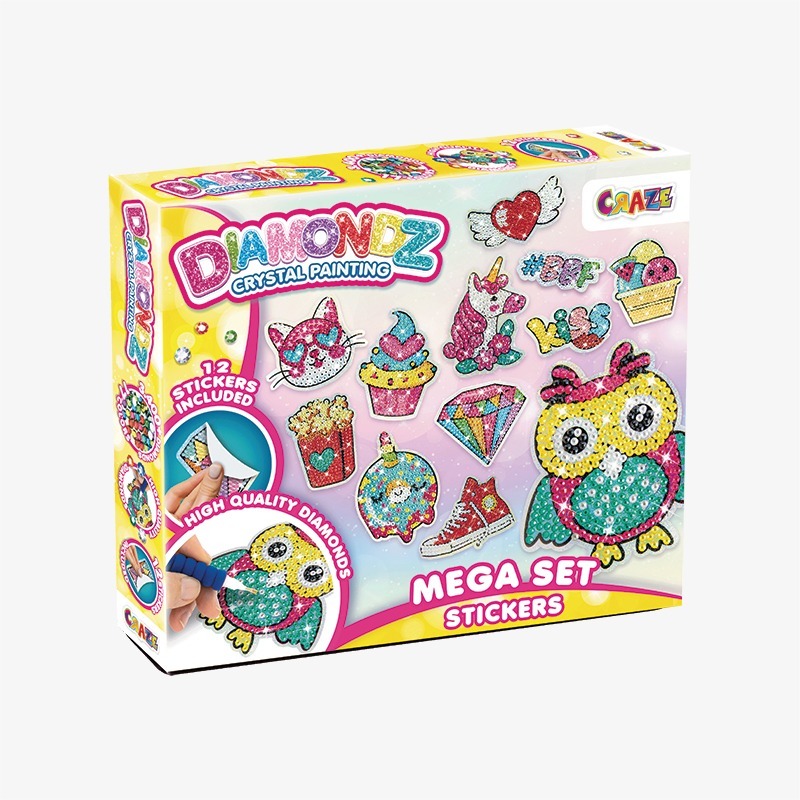 Descubre nuestro increíble Mega Set de Stickers DIAMONDZ y da rienda suelta a tu creatividad. Este amplio set incluye 12 plantillas de stickers para decorar con diamantes de colores. Crea tus propios stickers deslumbrantes. Incluye todas las herramientas que necesitas para tu proyecto.