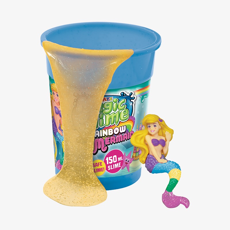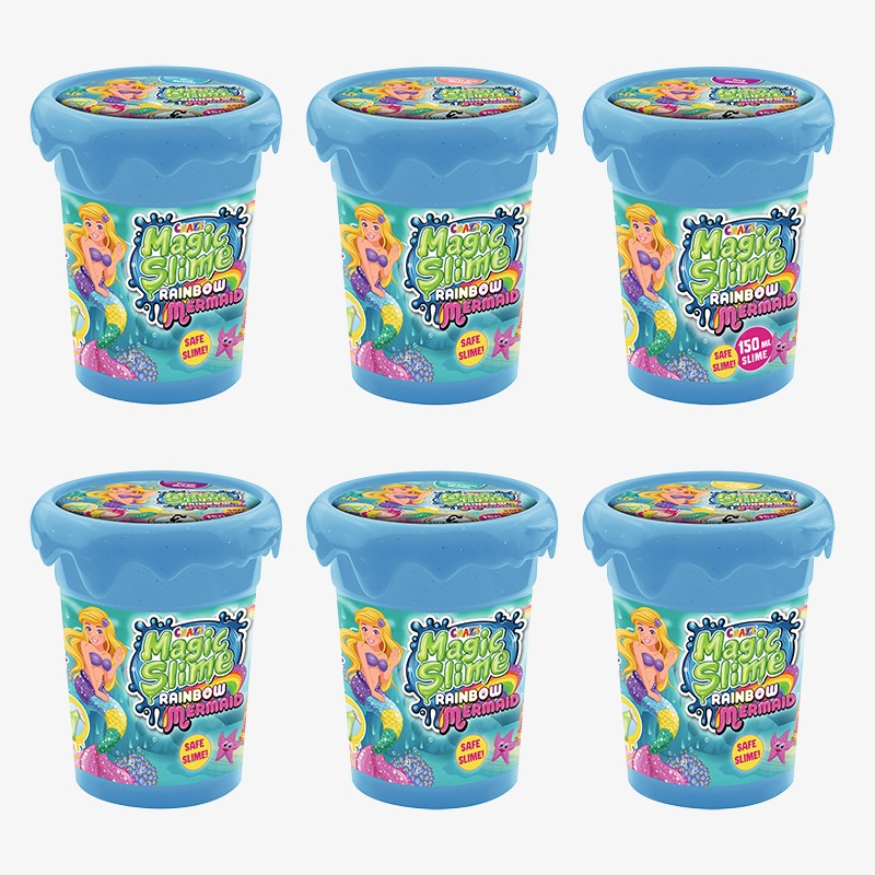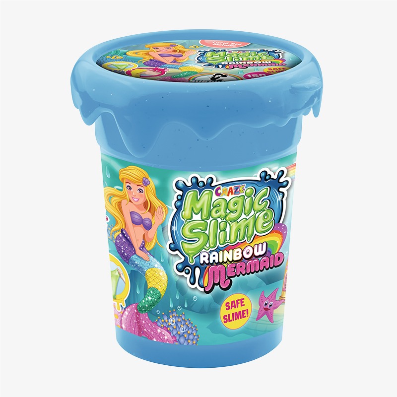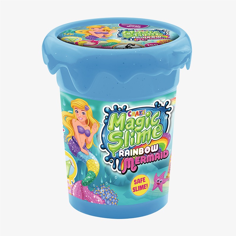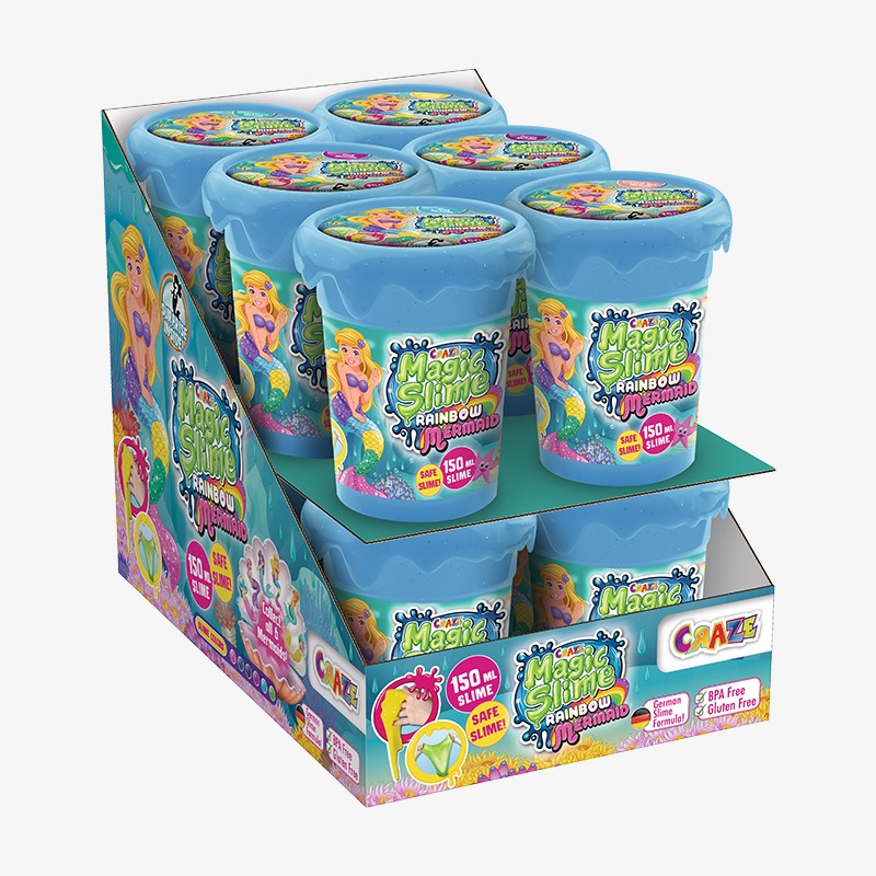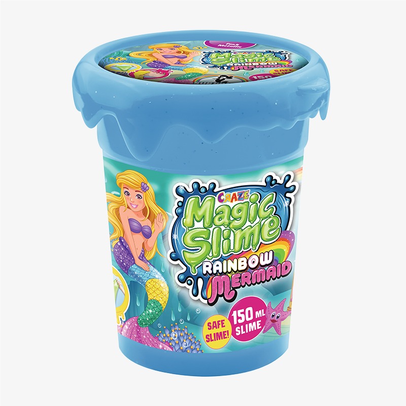 ¡Sorpresa! ¡Algo se esconde dentro del resbaladizo slime! ¿Qué podría ser? ¡Con MAGIC SLIME en la edición Mermaid, la diversión del juego está garantizada! Disponible en 6 colores, el slime colorido con efecto metálico se puede presionar y estirar. O simplemente puedes verlo derretirse o gotear. El MAGIC SLIME está disponible en el bonito diseño de Mermaid y con 1 de las 6 figuras en 3D para coleccionar. Cada una de las figuras está empaquetada en una bolsa ciega sorpresa para aumentar la tensión. El colorido MAGIC SLIME de CRAZE, basado en una fórmula alemana, es completamente inodoro y no contiene BPA ni gluten.